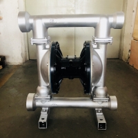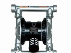 第三代气动隔膜泵,具有质量可靠使用寿命长、噪音底、震动小、不死机、做工精细等六大优点,即能抽送流动的液体,又能输送一些不易流动的介质,具有自吸泵、潜水泵、屏蔽泵、泥浆泵和杂质泵等输送机械的许多优点。在泵的两个对称工作腔中中各装有一块隔膜,由中心联杆将其连结成一体。压缩空气从泵的进气口进入配气阀,通过配气机构将压缩空气引入其中一腔,推动腔内隔膜运动,而另一腔中气体排出。一旦到达行程终点,配气机构自动将压缩空气引入另一工作腔,推动隔膜朝相反方向运动,从而使两个隔膜连续同步地往复运动。 在图示中压缩空气由进入配气阀,使膜片向右运动,则室的吸力使介质由入口流入,推动球阀进入室,球阀则因吸入而闭锁;室中的介质则被挤压,推开球阀由出口流出,同时使球阀闭锁,防流,就这样循环往复使介质不断从入口处吸入,出口处排出